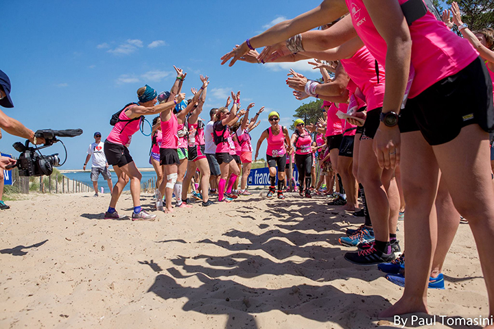 15h : C’est parti ! Les 40 participantes, toutes en rose, s’élancent et courent vers les paddles.