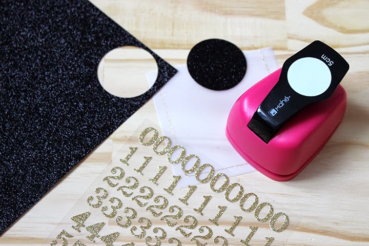 A l’aide d’une perforatrice découpez 25 ronds dans le papier glitter.
