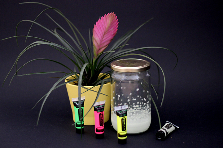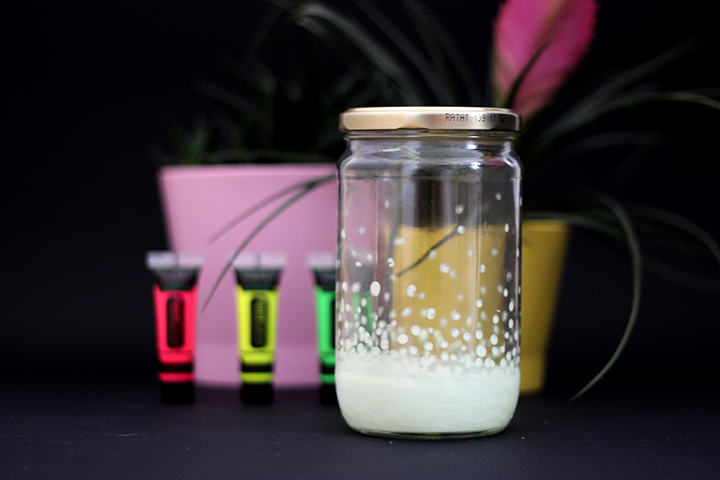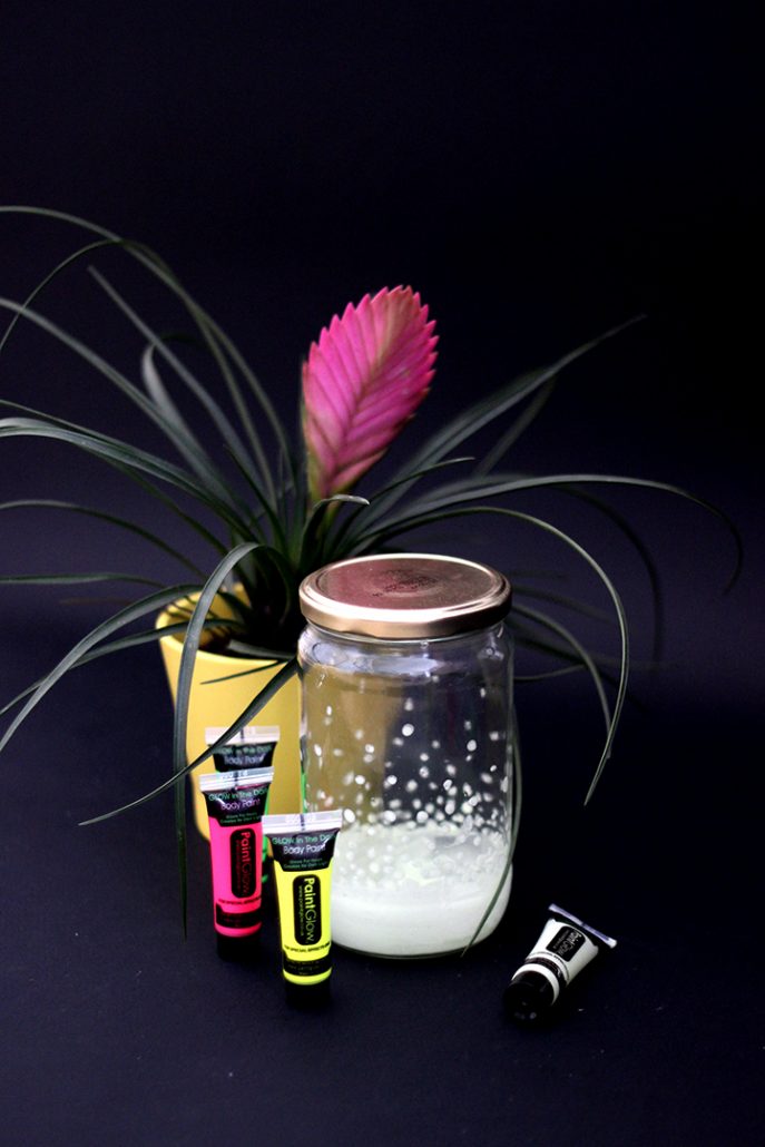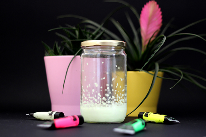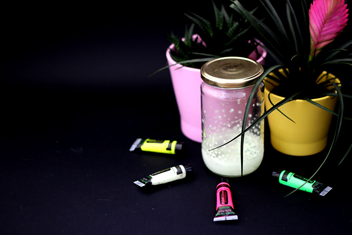 J’ai testé leur peinture fluorescente pour réaliser de jolis bocaux. De jour ce sont de jolis objets déco. De nuit les bocaux deviennent fluorescents et s’ils sont bien placé ils deviennent de vrais repères. Ça peut aussi être une astuce pratique pour si vos enfants ont peur du noir, un peu comme une veilleuse.