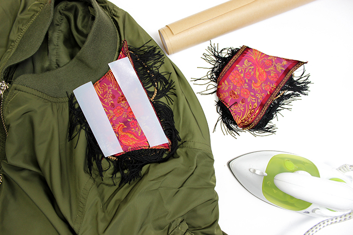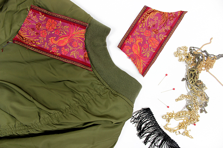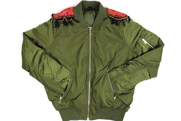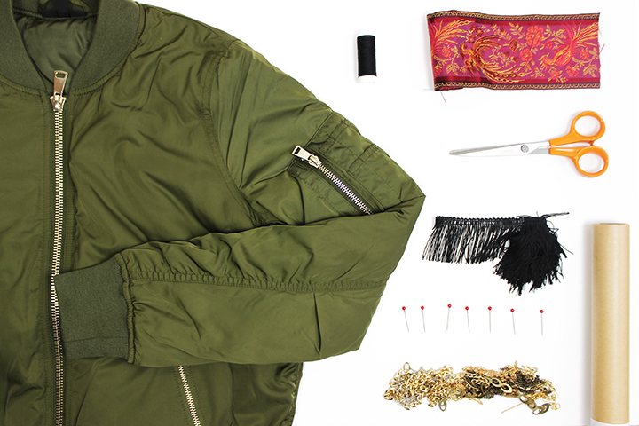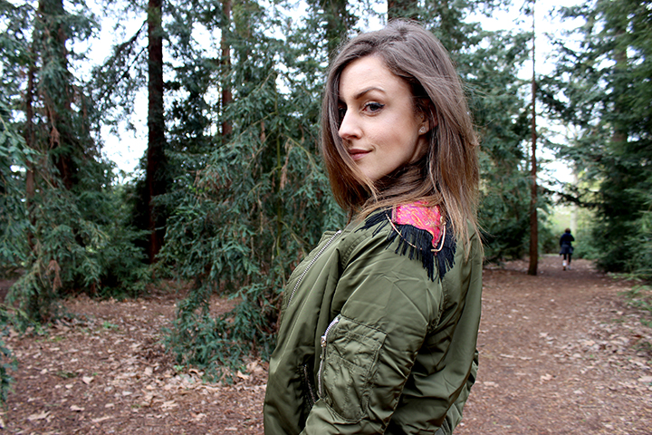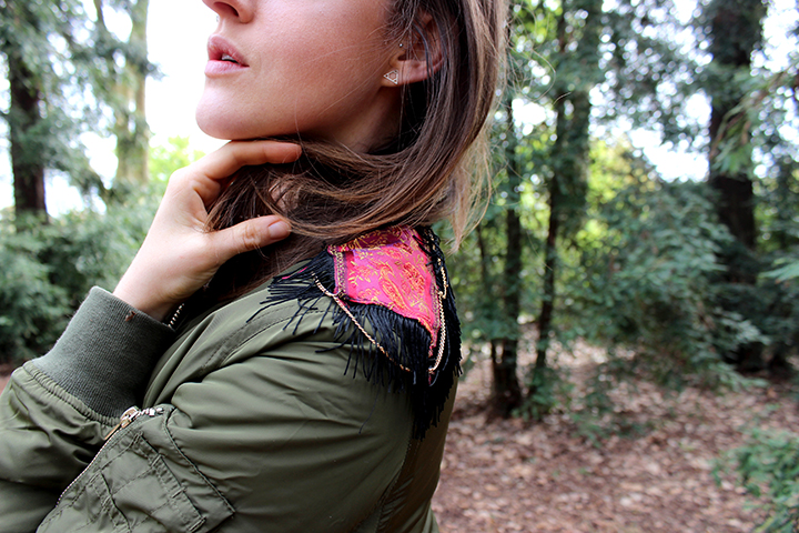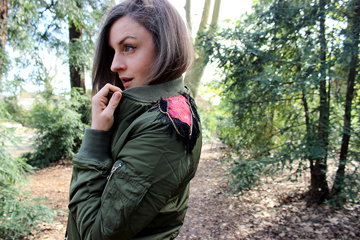 DIY Zalando. J’ai voulu donner un petit coup de peps à mon bomber uni avec une petite touche ethnique et un peu militaire qui va si bien avec le kaki.