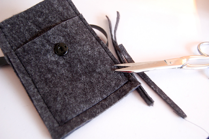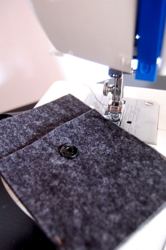 Coudre le bouton de pression sur un bout de ruban puis coudre celui si au ruban déjà pressant sur la pochette.
