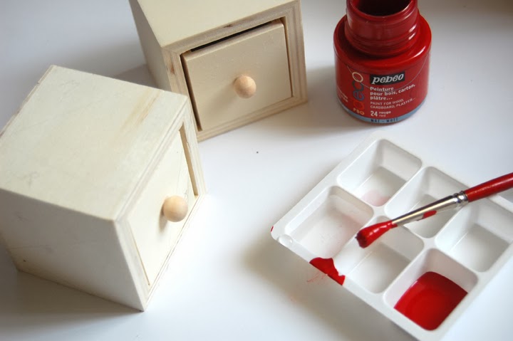 A l’aide d’un crayon et d’une règle déterminez les zones que vous allez peindre en rouge ou en marron. Peindre à la peinture à bois.