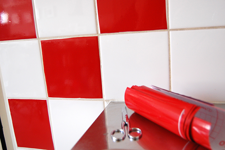 Il y a trois mois j’ai acheté un rouleau de sticker rouge en grande surface ( 7-8€ environ) pour la relooker un peu et rendre cet endroit où je passe pas mal de temps plus agréable.