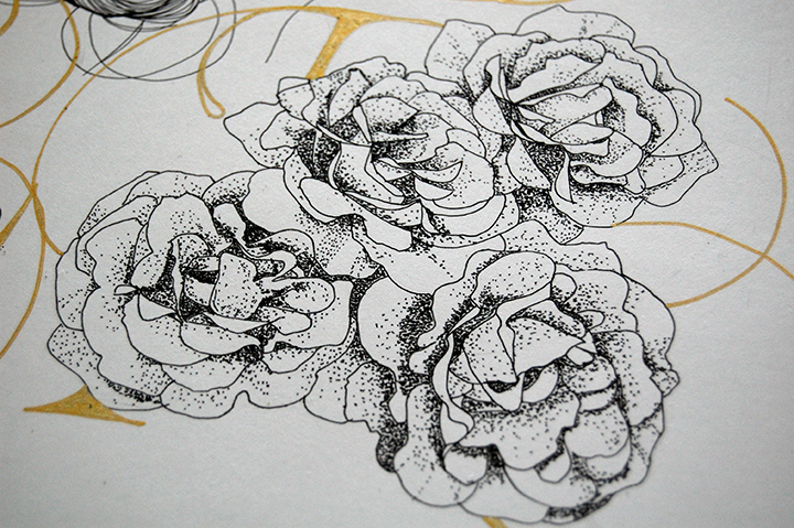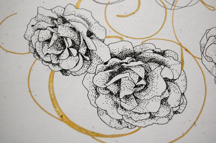 J’ai mis 4h à le réaliser. J’ai utilisé des Rotrings 0.1 0.2 (stylos à encre de chine) et un Posca doré. Le tout sur un papier technique A3.