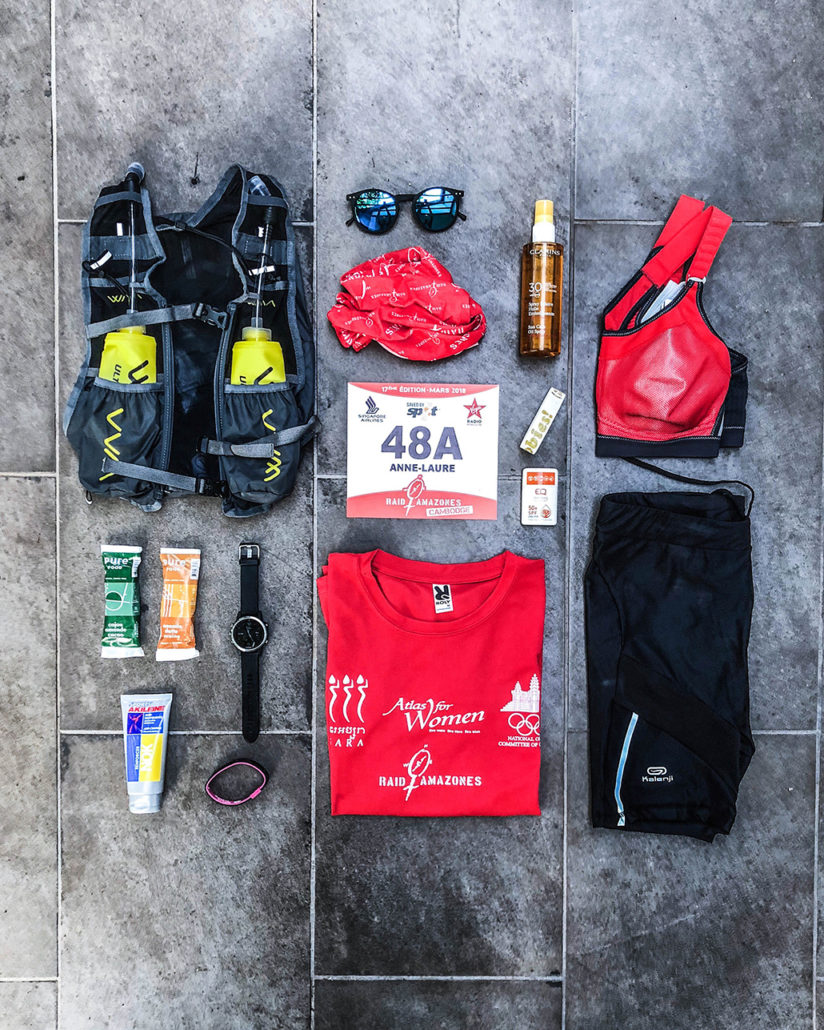Vous avez la possibilité de partir avec ZBO (organisation du Raid) ou prendre l’avion de votre coté. Quelques semaines avant le départ, nous avions reçu valise, t-shirts, sweat, casquette et tout l’équipement du Raid. Enorme avantage, dès notre arrivée à l’aéroport, on se repère entre futures amazones avec notre gros sac rouge. Pour le reste de l’équipement, on avait eu la liste de matériel obligatoire à amener (comme le kit pour réparer le vélo ou minimum en kamelback pour faire face à la chaleur). Si vous vous inscrivez au Raid, vous recevrez pas mal de newsletters, lisez les bien ! J’avais fait l’erreur de faire l’impasse en croulant un peu sous les mails avant mon départ ce qui nous a valu un petit stress de dernière minute pour les camelbaks dont on se serait bien passé. Mais je vous fais une petite check-list personnelle dans la suite de l’article.