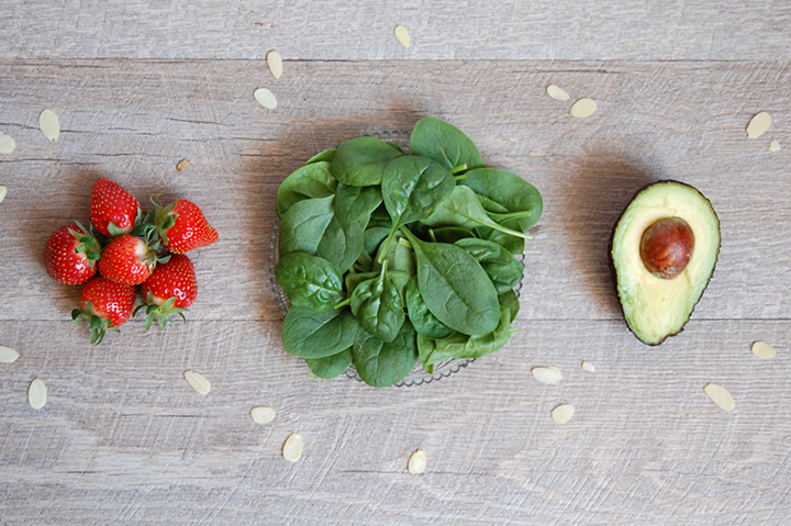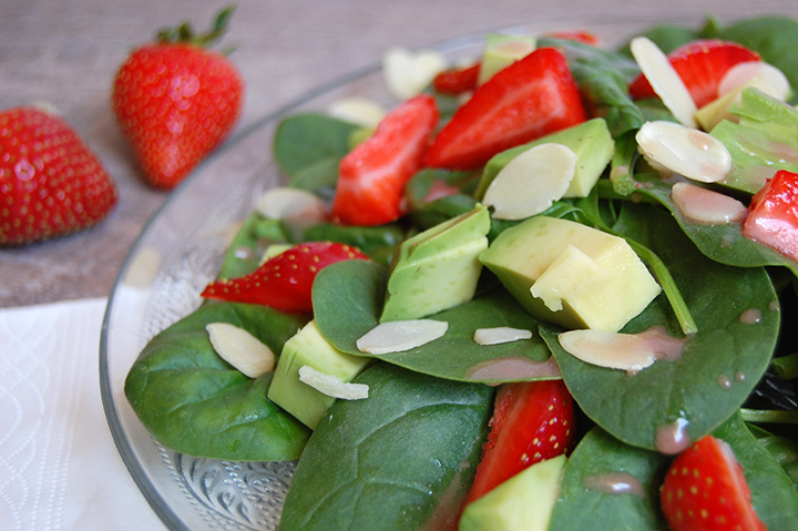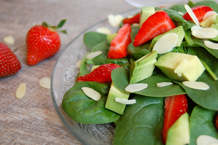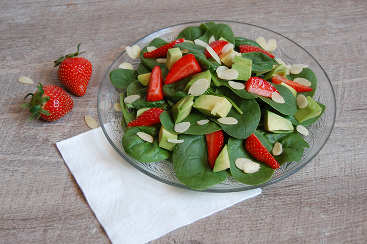 Par contre, si j'aime bien les fraises, les avocats, les pousses d'épinard et les amandes, les 4 ingrédients mélangés, je ne sais pas si ça me plairait. En fait je crois que je garderais les fraises pour le dessert 😉