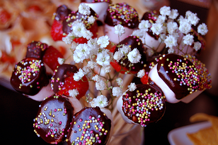 Super idée les tartelettes sur pâte filo, je testerai! et les fraises au chocolat sont très visuelles aussi, mélangées au gypsofile, c'est très beau; je testerai aussi!