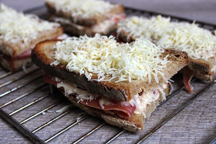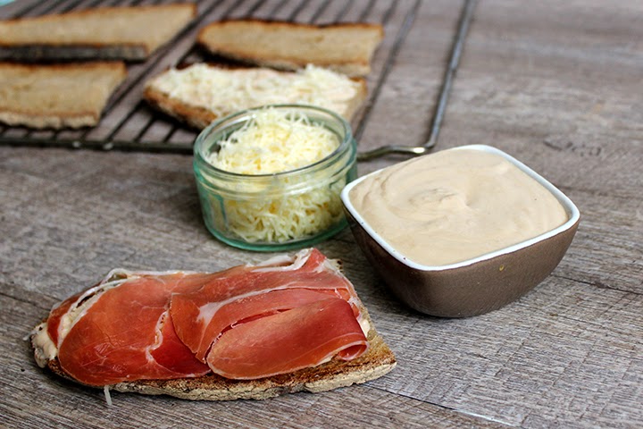 Montez vos croques : Un tranche de pain, de la crème, du gruyère, du jambon cru, re-du gruyère, re-de la crème, une tranche de pain, de la crème, du gruyère.