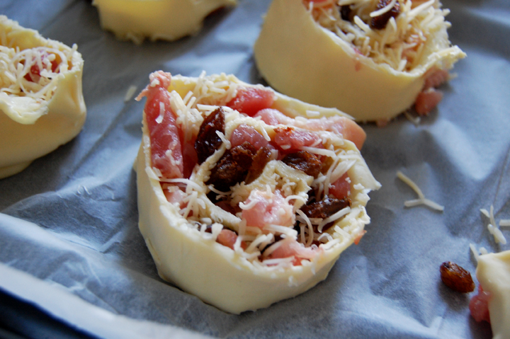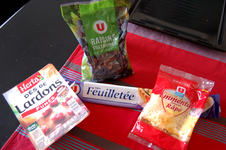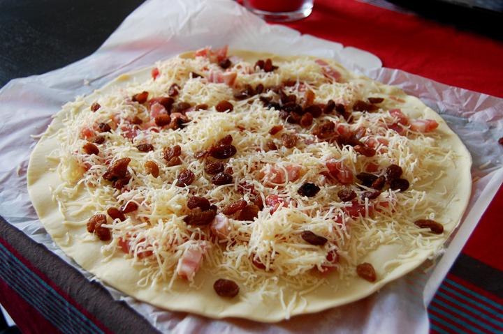Ajoutez dessus les lardons, l’emmental et des raisins secs