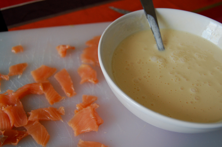Coupez des morceaux de saumon et placez les sur chaque petite tartelette.