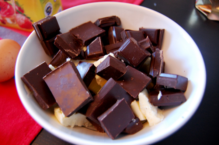 Coupez les carrés de chocolat et le beurre en dés et faites fondre au four à micro onde.