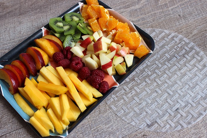 Plein de fruits ! Ici j’ai utilisé 1 kiwi, 1 nectarine, 1 pomme, 1 orange, 1 mangue et des framboises
