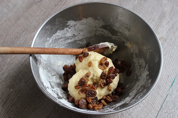 Mélangez tous les ingrédients jusqu’à obtenir un pâte bien homogène. Ajoutez les raisins en dernier.