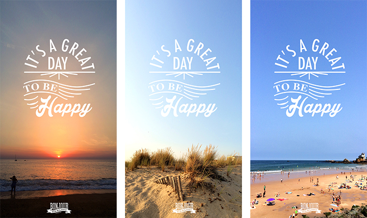 J’ai alors dessiné une phrase qui me motivait : « it’s a great day to be happy »… puis reproduit mon dessin sur l’ordinateur… puis j’ai sélectionné trois photos de mon été… Quelques minutes de photoshop plus tard j’envoyais à mon amoureux trois choix de fond d’écran que j’ai le plaisir de vous proposer ici (en espérant qu’ils vont vous plaire et devenir votre fond d’écran).