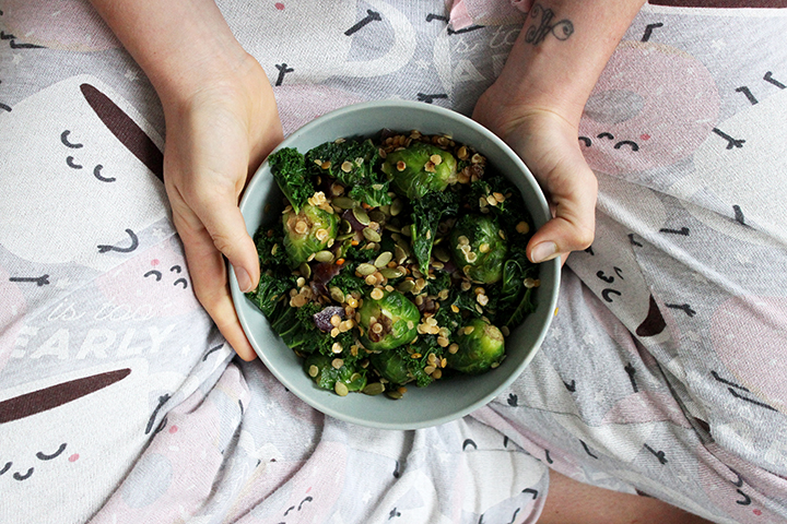 Donc c’est parti ! Pâtes, riz, boulgour, quinoa ! À vos glucides. On ne change pas l’apport en protéine habituel et on limite les crudités et les fruits frais qui accélèrent le transit ainsi que les graisses. On préfère les légumes cuits.